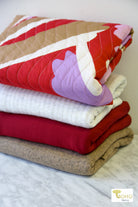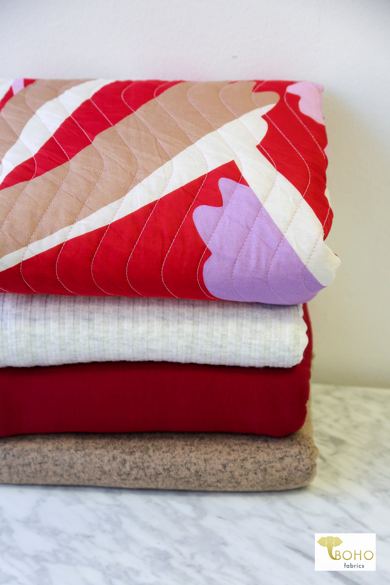 What’s Inside: - Zen Bloom, Crimson Quilted Knit - Rayon/Spandex: Ruby Red - Brushed Sweater Knit: Warm Honey - Brushed Rib Knit: Oatmeal (PLEASE NOTE: THE BUNDLE SHOWS A DIFFERENT RIB. SEE PHOTO #2 & #3 FOR WHAT HAS BEEN SUBSTITUTED!)