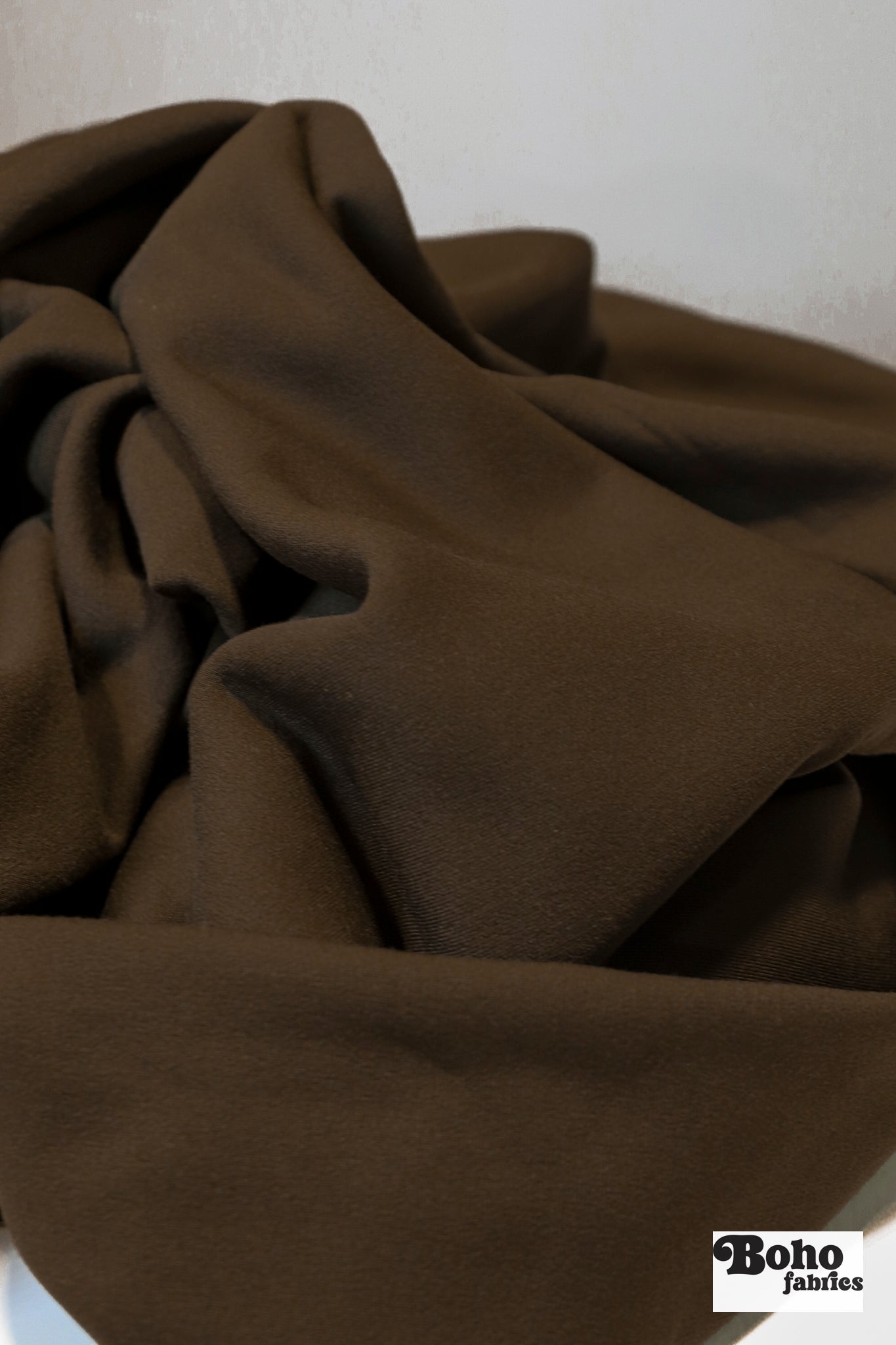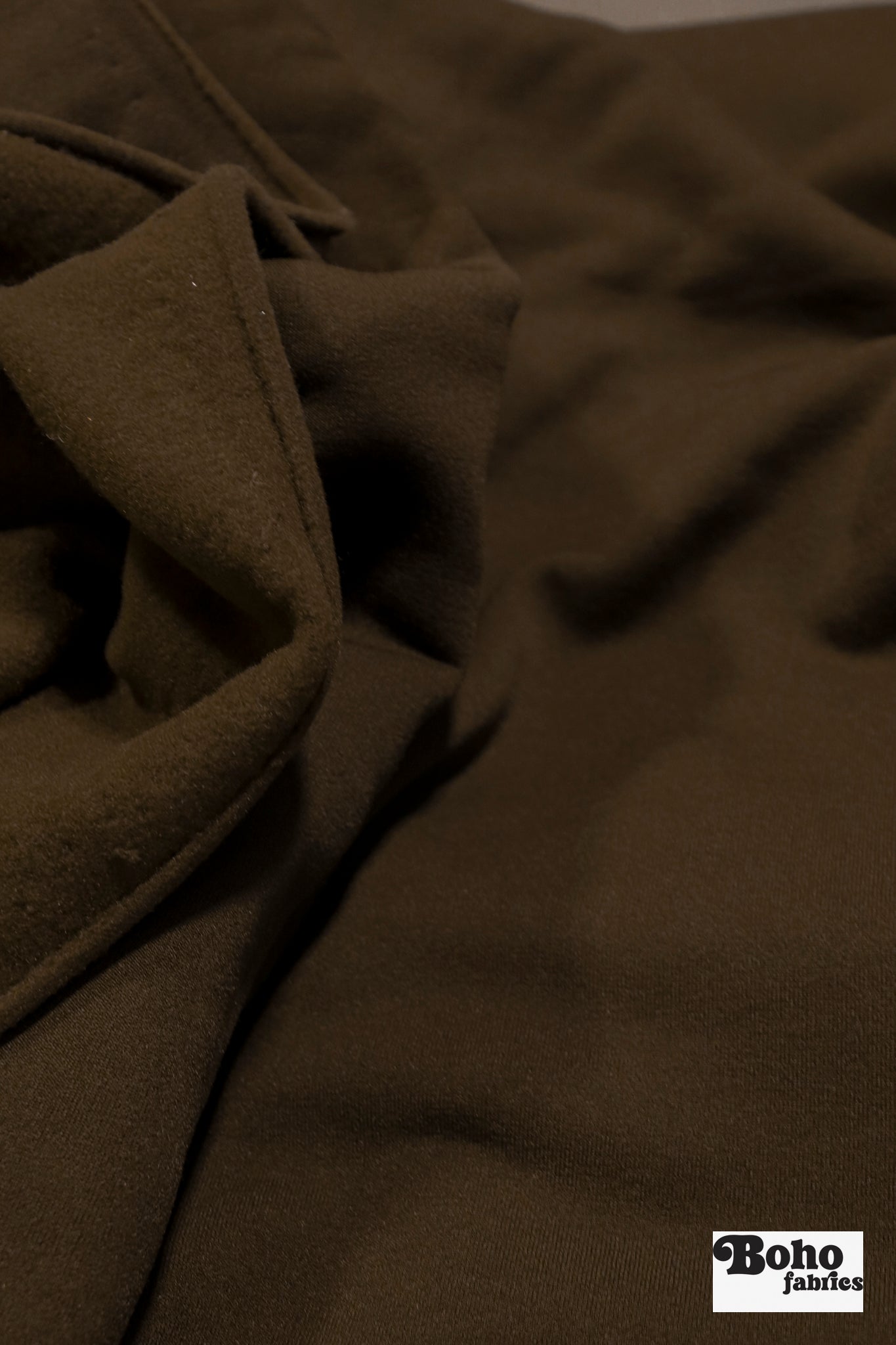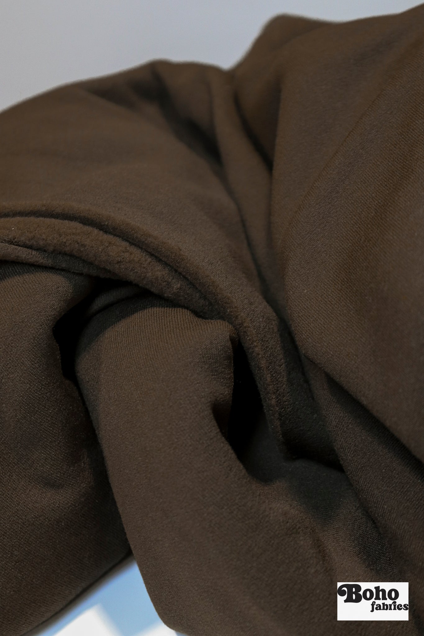 Warm, earthy brown with a smooth performance face and an insulating fleece back. This fabric feels like a premium athletic fleece but with better recovery and mobility for cold-weather activewear, lounge sets, and winter layers.