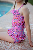 English Garden on Pink Swim Print Knit Fabric offers a charming floral pattern with 80% Nylon and 20% Spandex. This fabric has a weight of 10 oz and a width of 58-60", providing excellent stretch and quick-drying properties.